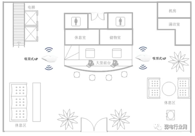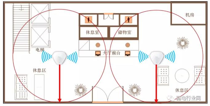大堂相對空曠,阻隔物較少,吸頂式AP在空曠環(huán)境中覆蓋直徑20-30米,中小型賓館大堂可根據(jù)具體結(jié)構(gòu)布置2-3個AP即可,大型賓館大堂可根據(jù)需求增加,如下圖所示: