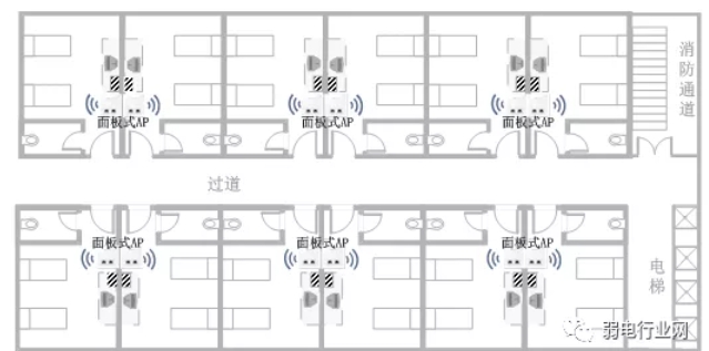 客房接入環(huán)境密集、墻壁阻隔較多,對無線信號的衰減相對較大,面板式AP推薦每個房間部署一臺。如下圖所示:
