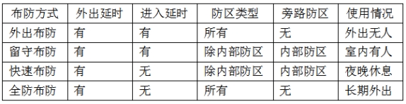外出布防:是指需要對(duì)全體防區(qū)進(jìn)行布防時(shí)進(jìn)行的操作。此時(shí)全部防區(qū)都有效,提供延時(shí)。