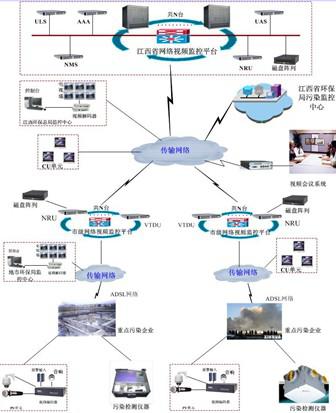 河南新交際系統(tǒng)通過河南電信的ADSL寬帶網(wǎng)絡(luò)將前端監(jiān)控點(diǎn)視音頻信號(hào)和污染參數(shù)接入“全球眼”平臺(tái)。