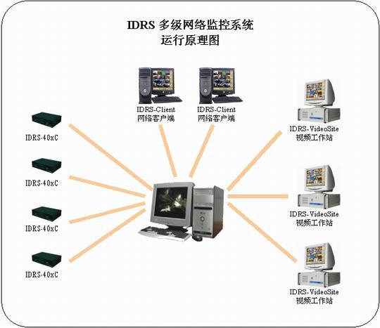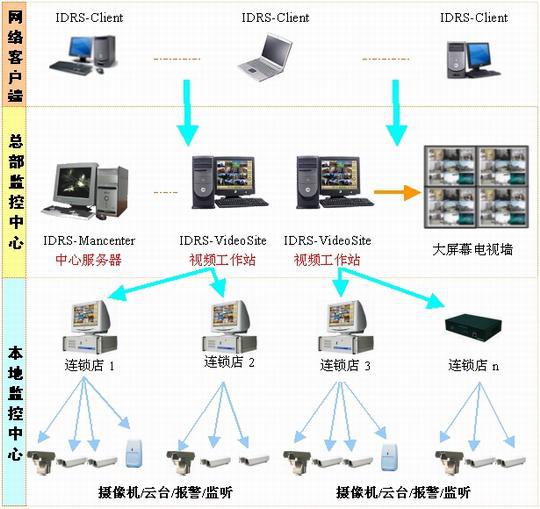 總部監(jiān)控中心采用IDRS分布式監(jiān)控管理系統(tǒng),該系統(tǒng)由視頻工作站、中心服務(wù)器、網(wǎng)絡(luò)客戶端組成。利用IP網(wǎng)絡(luò)可以同時(shí)監(jiān)控管理成百上千個(gè)監(jiān)控點(diǎn)。