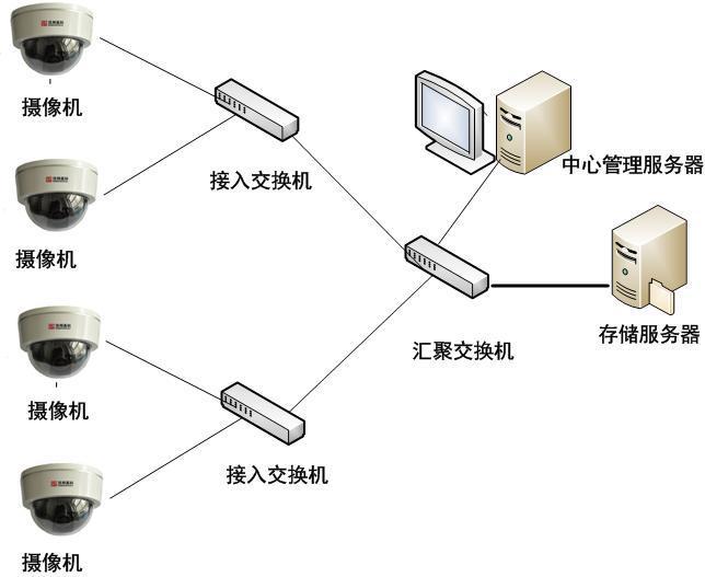 前端高清攝像機(jī)與接入交換機(jī)之間通過(guò)超5類網(wǎng)線連接,接入交換機(jī)與核心交換機(jī)之間通過(guò)光纖連接。