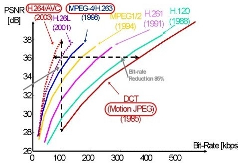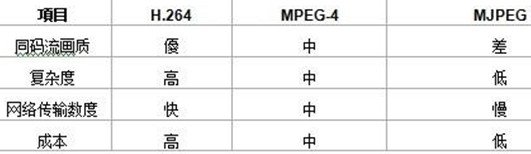 由上圖可知,在同樣的Bitrate下,H.264的畫(huà)質(zhì)是最好的,例如在Bitrate100kbps時(shí),H.264大約比MPEG4好3dB(約2倍),更比MJPEG好約10dB(約10倍),換句話(huà)說(shuō),同樣容量的硬盤(pán),在儲(chǔ)存畫(huà)質(zhì)及速率一樣的情況之前,H.264可以比MPEG4多儲(chǔ)存2倍的時(shí)間,比MJPEG多儲(chǔ)存10倍的時(shí)間。也即同樣的Bitrate下,MPEG4、MJPEG傳輸所占的帶寬分別是H,264的2倍和10倍。