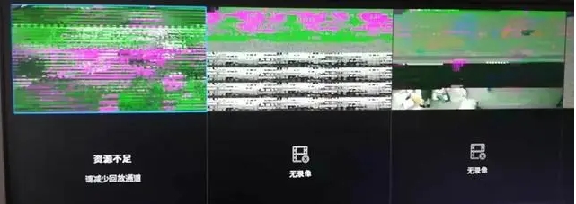某工程商使用NVR出現(xiàn)花屏問題,多個(gè)畫面下方出現(xiàn)大塊紫色、綠色、灰色的色塊,無法正常顯示視頻。